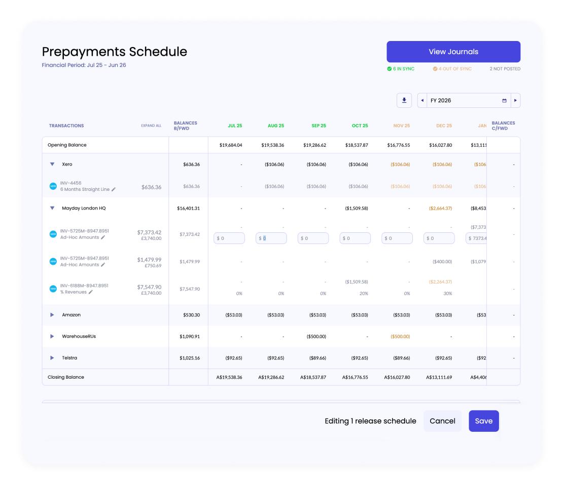 Prepayments automates the creation of your prepayment schedules and expense amortisation entries.